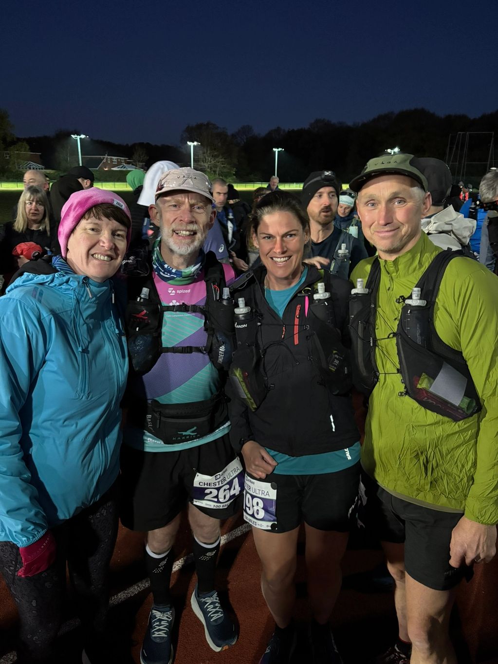 On the start line of Chester 100 (Apr 25) with our YouTube heroes The Trail Running Couple, Gary and Cheryl Mort.